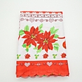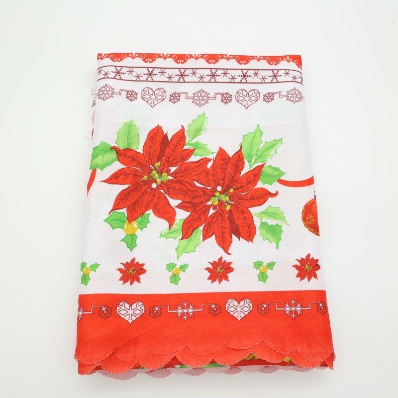 Όμορφο χριστουγεννιάτικο τραπεζομάντηλο σε λευκό και κόκκινο χρώμα, διακοσμημένο με εντυπωσιακά αλεξανδρινά, φύλλα ελάτου και παραδοσιακά γιορτινά μοτίβα. Οι κόκκινες μπορντούρες και το διακοσμητικό τελείωμα χαρίζουν κομψότητα και ζεστασιά στο χριστουγεννιάτικο τραπέζι.