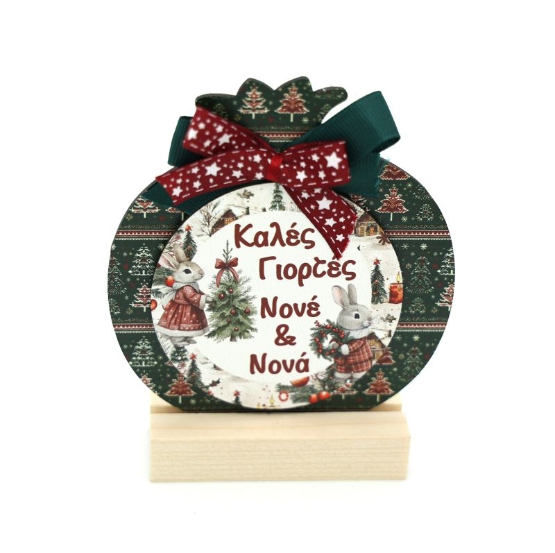 Χαριτωμένο χριστουγεννιάτικο διακοσμητικό με τρυφερό μήνυμα «Καλές Γιορτές Νοvέ & Νοvά», ιδανικό για να εκφράσετε τις γιορτινές σας ευχές στους αγαπημένους νονούς. Το γιορτινό σχέδιο με λαγουδάκια, χριστουγεννιάτικο δέντρο και ζεστές χειμωνιάτικες λεπτομέρειες αποπνέει θαλπωρή και γιορτινή μαγεία.