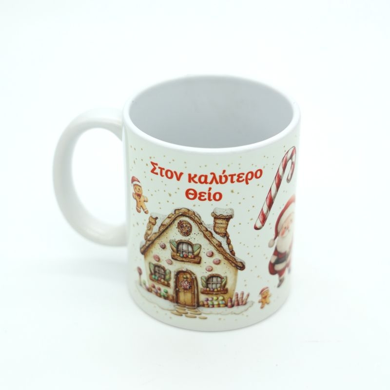 Γιορτινή κούπα με τρυφερό μήνυμα «Στον καλύτερο Θείο», ιδανική για ένα ξεχωριστό χριστουγεννιάτικο δώρο. Το χαρούμενο εορταστικό σχέδιο με το σπιτάκι από μπισκότο, τον Άγιο Βασίλη και γλυκές λεπτομέρειες δημιουργεί μια ζεστή, χριστουγεννιάτικη ατμόσφαιρα.