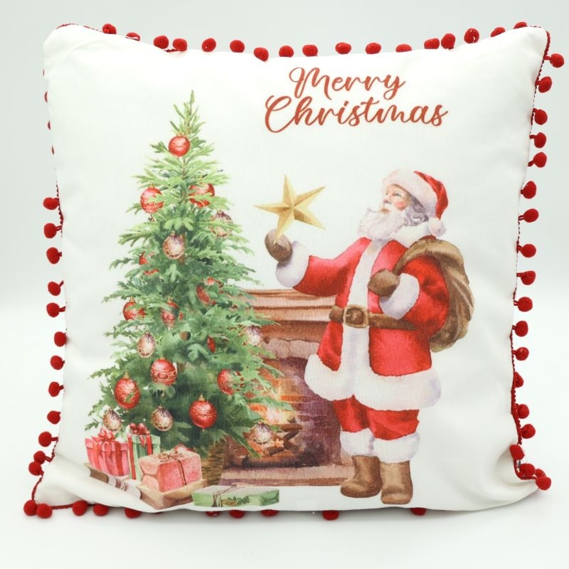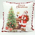 Γιορτινό διακοσμητικό μαξιλάρι με κλασική χριστουγεννιάτικη απεικόνιση του Άγιου Βασίλη δίπλα στο στολισμένο δέντρο και ευχή «Merry Christmas». Ο κομψός σχεδιασμός ολοκληρώνεται με κόκκινα διακοσμητικά πομ-πομ περιμετρικά, προσθέτοντας μια ζεστή και χαρούμενη πινελιά στον χώρο.