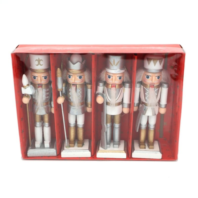 Κομψό χριστουγεννιάτικο σετ με 4 διακοσμητικά στολίδια καρυοθραύστες, σε λευκές, χρυσές και ασημί αποχρώσεις. Κάθε στολίδι διαθέτει λεπτομερή σχεδιασμό και κλασικό βασιλικό ύφος, προσφέροντας παραδοσιακή και γιορτινή αίσθηση.