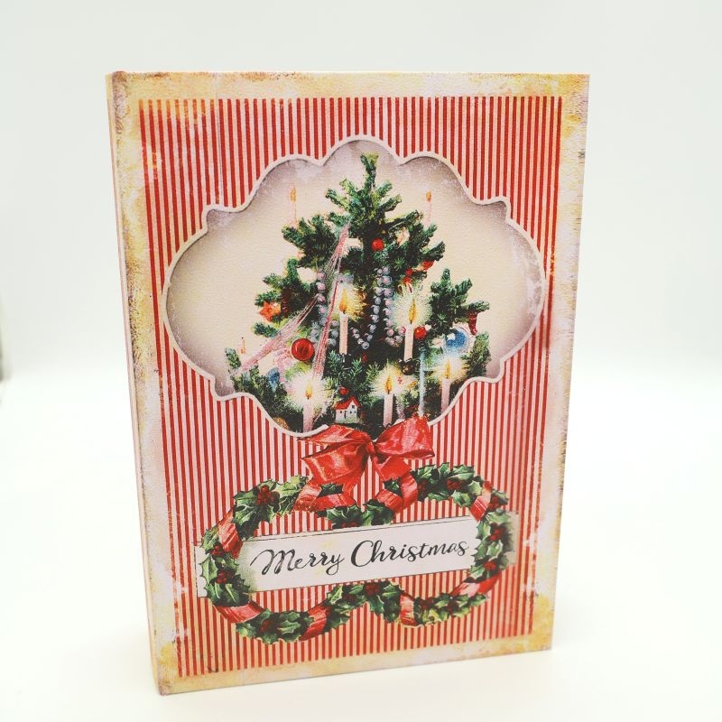 Εντυπωσιακό ξύλινο διακοσμητικό σε μορφή βιβλίου, με χριστουγεννιάτικο vintage σχέδιο και την ευχή “Merry Christmas”. Διακοσμημένο με εορταστικό στεφάνι, φιόγκο και χριστουγεννιάτικο δέντρο, προσθέτει ζεστασιά και γιορτινή ατμόσφαιρα σε κάθε χώρο.