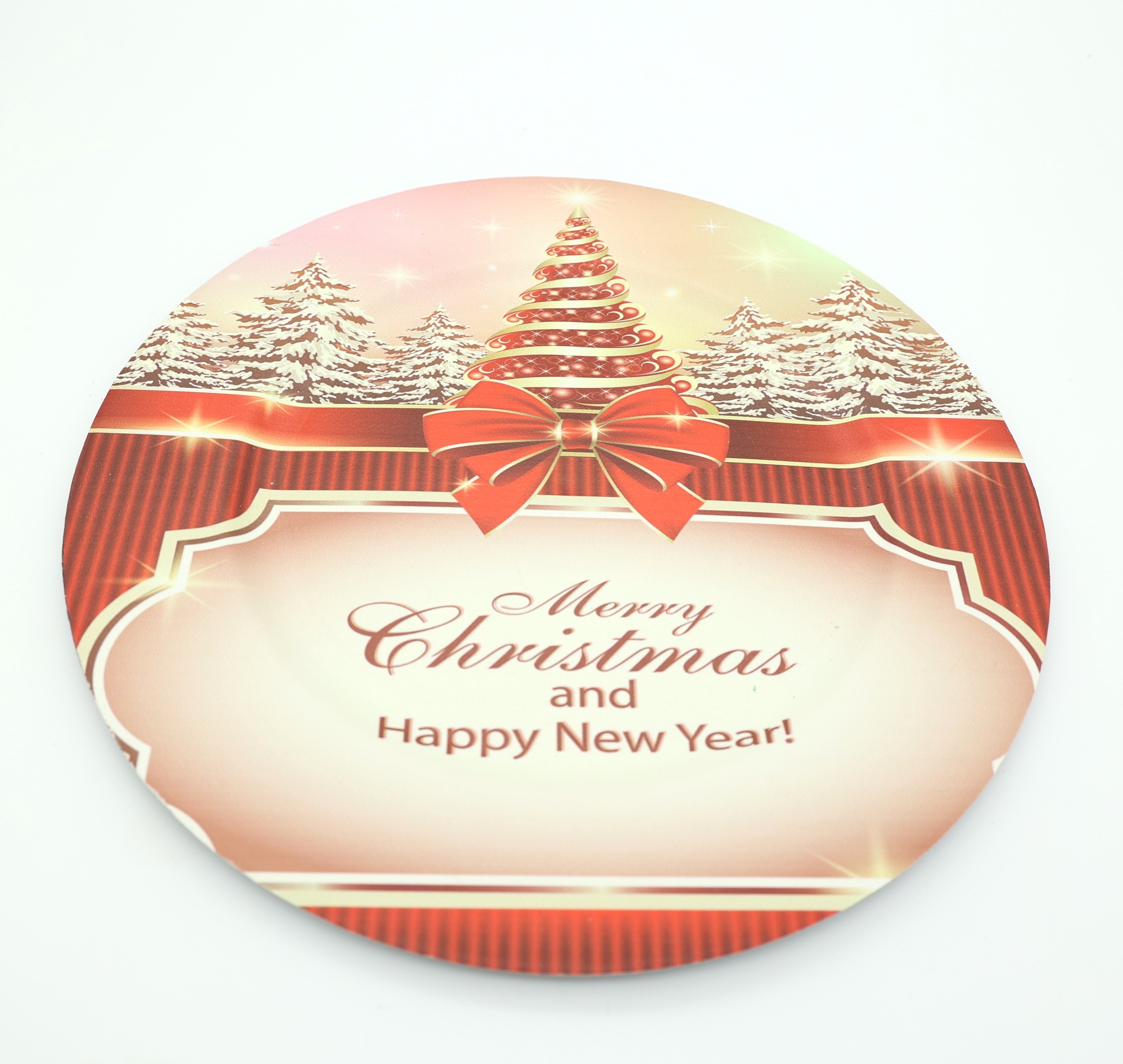 Εντυπωσιακή χριστουγεννιάτικη πιατέλα με εορταστικό σχέδιο, χριστουγεννιάτικο δέντρο, φιόγκο και την ευχή “Merry Christmas and Happy New Year”. Οι ζεστές αποχρώσεις του κόκκινου και του χρυσού δημιουργούν μια λαμπερή και γιορτινή ατμόσφαιρα στο τραπέζι σας.