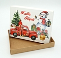 Όμορφο χριστουγεννιάτικο κουτί για δωράκι με γιορτινή εικονογράφηση που απεικονίζει χιονάνθρωπο, κόκκινο vintage φορτηγάκι με χριστουγεννιάτικο δέντρο και παραδοσιακά διακοσμητικά στοιχεία. Η επιγραφή «Καλές Γιορτές» προσθέτει ζεστασιά και εορταστικό χαρακτήρα.