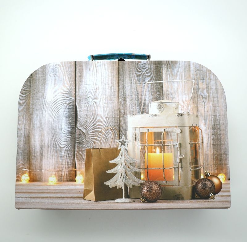 Κομψό χριστουγεννιάτικο κουτί με vintage αισθητική ξύλου και ζεστό γιορτινό σχέδιο με φωτισμένο παράθυρο. Διαθέτει μεταλλικό κούμπωμα ασφαλείας και χερούλι, θυμίζοντας μικρή βαλιτσούλα, ιδανική για ξεχωριστές συσκευασίες δώρων.