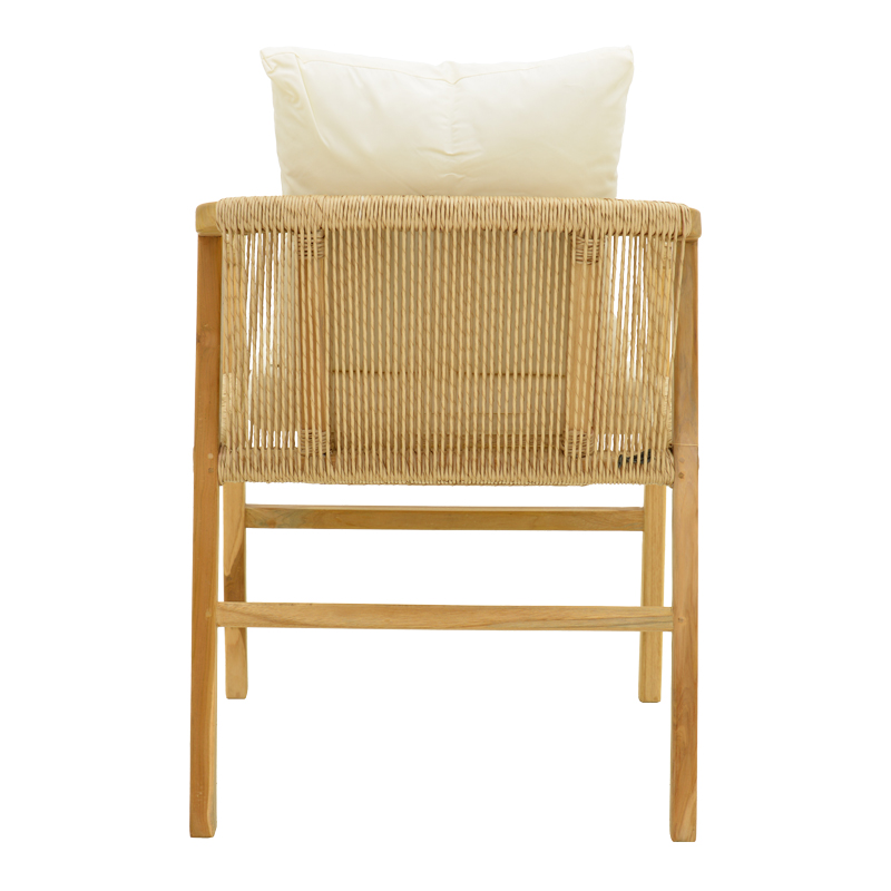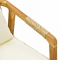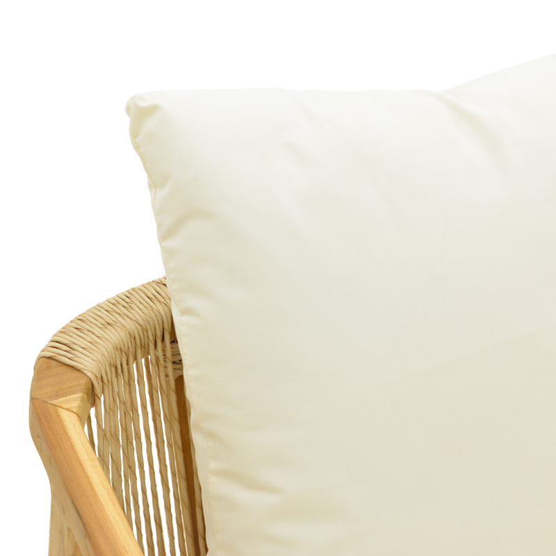 - Η πολυθρόνα συνοδεύεται από μαλακά, άνετα μαξιλάρια σε ουδέτερη απόχρωση, τα οποία συμπληρώνουν αρμονικά την ξύλινη και σχοινένια υφή