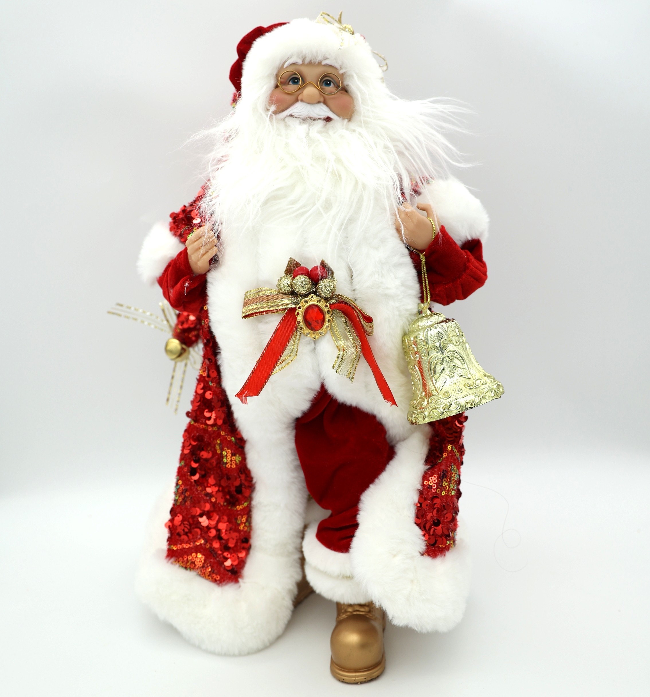 Εντυπωσιακός διακοσμητικός Άγιος Βασίλης με πλούσια ενδυμασία και ιδιαίτερες λεπτομέρειες, που προσθέτει κομψότητα και γιορτινή λάμψη σε κάθε χριστουγεννιάτικο χώρο. Φοράει κόκκινη στολή με παγιέτες, λευκή γούνινη επένδυση και κρατά χρυσό καμπανάκι, δημιουργώντας μια αίσθηση πολυτέλειας και παράδοσης.