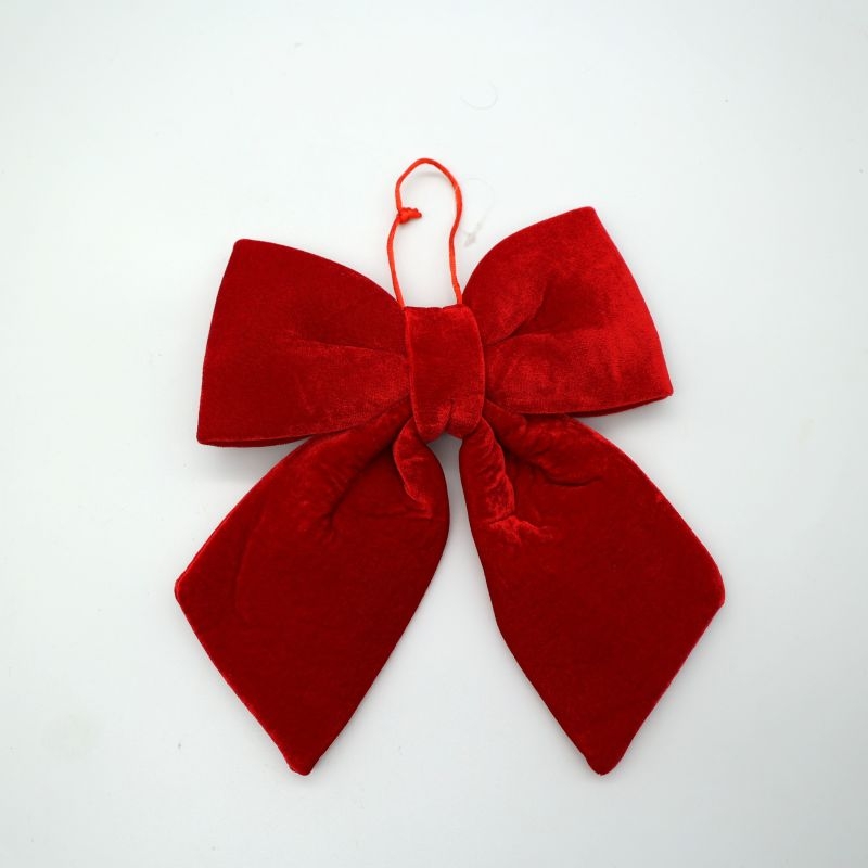 Κομψός χριστουγεννιάτικος φιόγκος από απαλό βελούδο σε έντονο κόκκινο χρώμα, που προσθέτει πολυτέλεια και ζεστασιά σε κάθε γιορτινή διακόσμηση. Διαθέτει κορδόνι ανάρτησης για εύκολη τοποθέτηση σε δέντρο, στεφάνι, πόρτα ή συσκευασία δώρων.