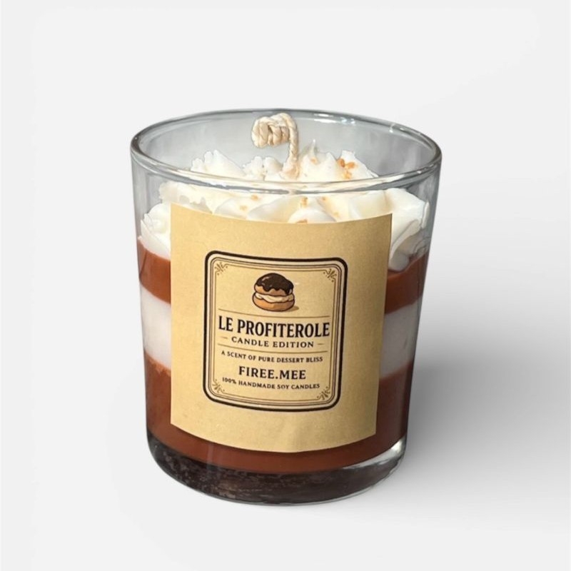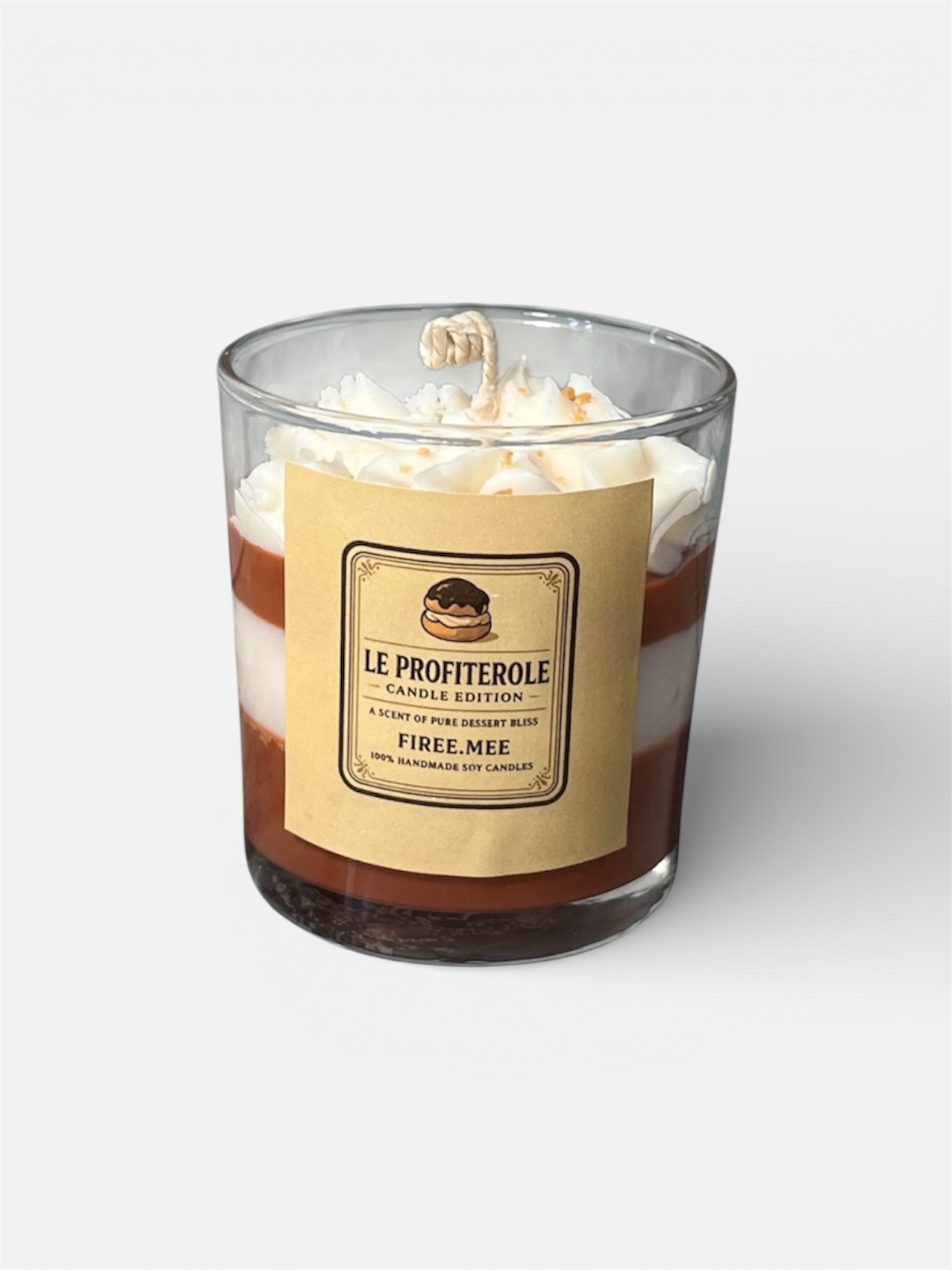 Χειροποίητο αρωματικό κερί από 100% φυτική σόγια, εμπνευσμένο από το αγαπημένο γαλλικό επιδόρπιο profiterole. Ο πλούσιος συνδυασμός σοκολάτας, βανίλιας και γλυκιάς κρέμας δημιουργεί μια απολαυστική και ζεστή ατμόσφαιρα που θυμίζει φρεσκοφτιαγμένο γλυκό.