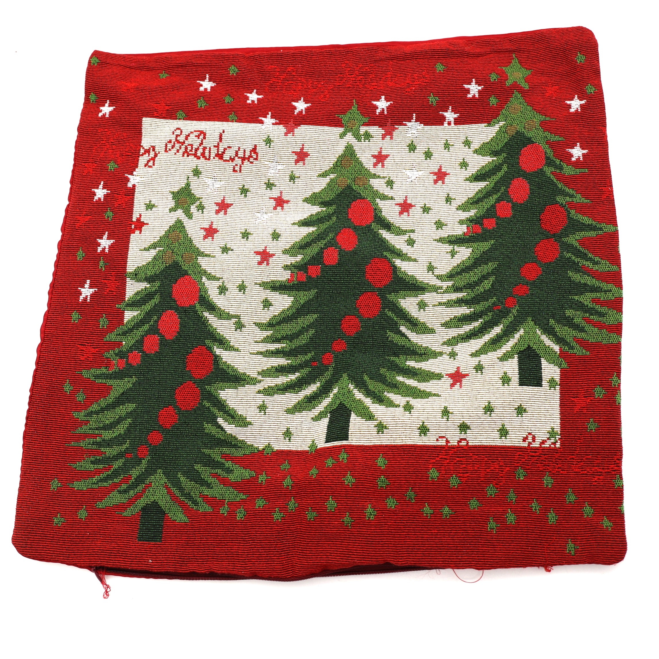 Εορταστική υφασμάτινη θήκη μαξιλαριού με χριστουγεννιάτικο σχέδιο από στολισμένα έλατα σε κόκκινες και πράσινες αποχρώσεις. Η υφή τύπου gobelin προσδίδει πολυτελή όψη και ανθεκτικότητα, ενώ τα παραδοσιακά μοτίβα δημιουργούν ζεστή και γιορτινή ατμόσφαιρα στον χώρο.