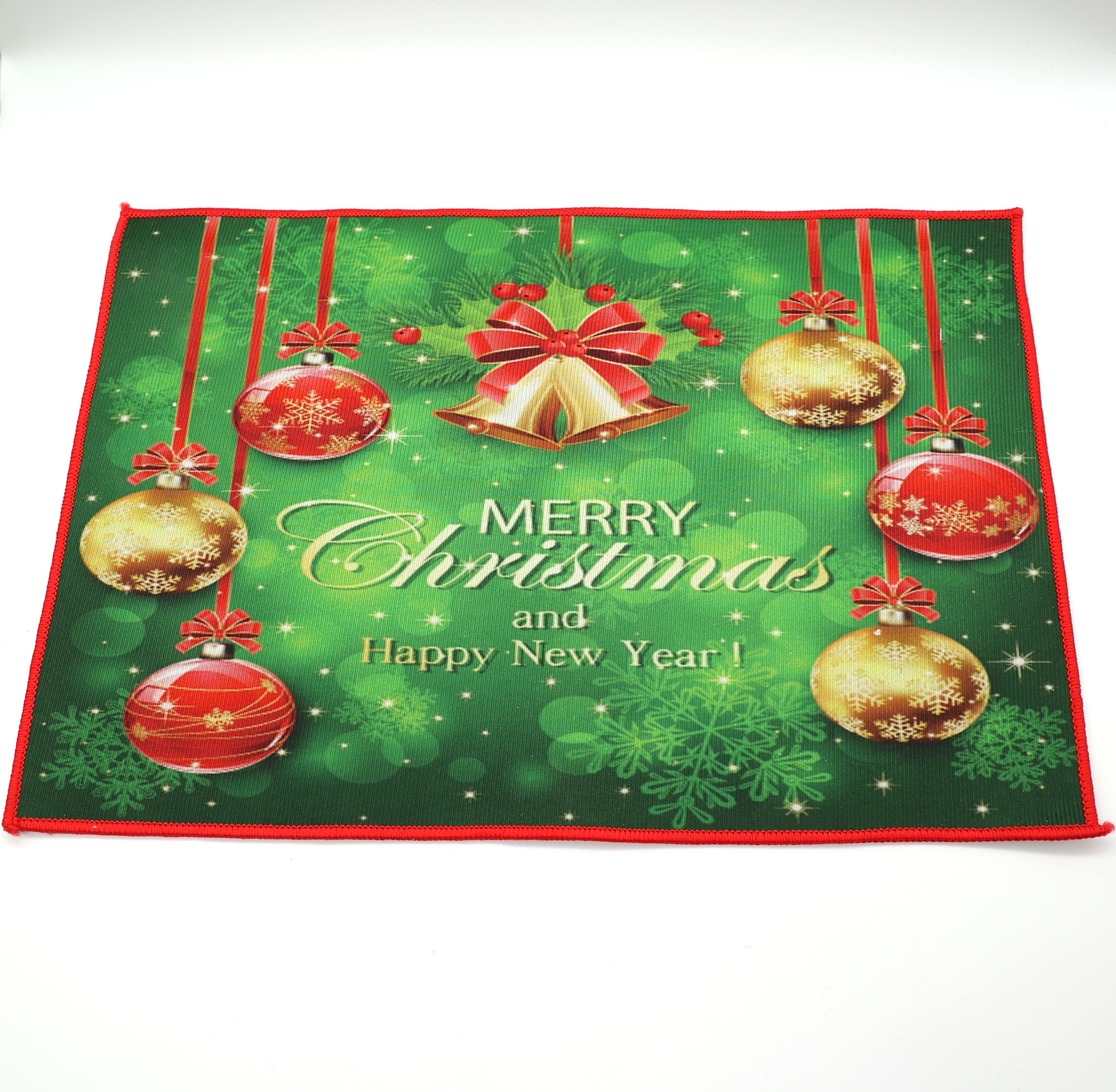 Γιορτινό χριστουγεννιάτικο χαλάκι με εντυπωσιακό σχέδιο από κρεμαστές μπάλες, καμπανάκια και το μήνυμα «Merry Christmas and Happy New Year». Οι αποχρώσεις του πράσινου, κόκκινου και χρυσού δημιουργούν ζεστή και χαρούμενη ατμόσφαιρα, ιδανική για τις γιορτές.
