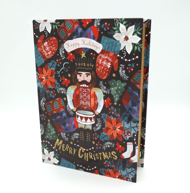 Διακοσμητικό βιβλίο–κουτί με χριστουγεννιάτικο, εμπνευσμένο από την κλασική γιορτινή αισθητική. Διαθέτει πλούσια εικονογράφηση με καρυοθραύστη, γάντια, αλεξανδρινά και χειμερινά μοτίβα, σε σκούρο φόντο με χρυσές λεπτομέρειες. Ανοίγει σαν βιβλίο και μπορεί να χρησιμοποιηθεί ως κρυφός αποθηκευτικός χώρος για μικροαντικείμενα.