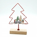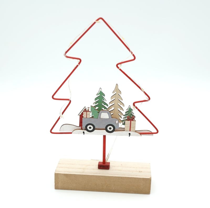 Μοναδικό χριστουγεννιάτικο διακοσμητικό σε σχήμα δέντρου, κατασκευασμένο από μεταλλικό περίγραμμα σε κόκκινο χρώμα και ξύλινη βάση. Στο κέντρο του δεσπόζει χαριτωμένη σύνθεση με αυτοκινητάκι, χριστουγεννιάτικα δέντρα και δώρα, δημιουργώντας μια ζεστή και γιορτινή σκηνή.