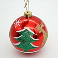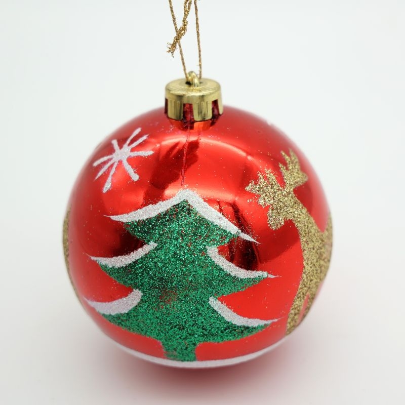 Κομψή χριστουγεννιάτικη μπάλα σε λαμπερό κόκκινο χρώμα, διακοσμημένη με πράσινο χριστουγεννιάτικο δεντράκι από γκλίτερ και χρυσές εορταστικές λεπτομέρειες. Ο συνδυασμός των παραδοσιακών χρωμάτων δημιουργεί ένα ζεστό και κλασικό αποτέλεσμα που ταιριάζει απόλυτα με κάθε χριστουγεννιάτικη διακόσμηση.