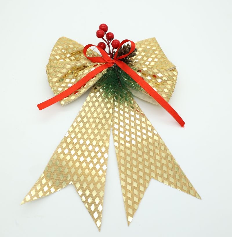 Εντυπωσιακός χριστουγεννιάτικος φιόγκος σε χρυσή απόχρωση με γεωμετρικό μοτίβο, ιδανικός για κομψή και γιορτινή διακόσμηση. Ο φιόγκος είναι διακοσμημένος με κόκκινες μπίλιες, κουκουνάρι και πράσινο κλαδάκι, δεμένα με κόκκινη κορδέλα, δημιουργώντας ένα πλούσιο και παραδοσιακό χριστουγεννιάτικο αποτέλεσμα.
