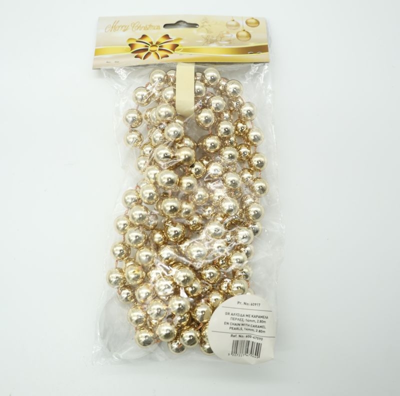 Κομψή χριστουγεννιάτικη γιρλάντα με πέρλες σε ζεστή χρυσή απόχρωση, ιδανική για να προσθέσει λάμψη και πολυτέλεια στον εορταστικό σας διάκοσμο. Οι γυαλιστερές πέρλες είναι δεμένες μεταξύ τους με ανθεκτικό νήμα, δημιουργώντας ένα εντυπωσιακό αποτέλεσμα που αντανακλά το φως και αναδεικνύει κάθε χριστουγεννιάτικη σύνθεση.