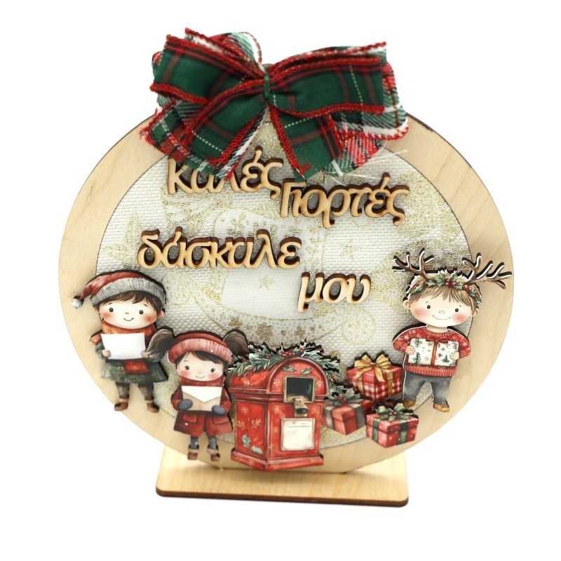Ολοκληρώνεται με υφασμάτινο καρό φιόγκο σε κόκκινες και πράσινες αποχρώσεις και στηρίζεται σε ξύλινη βάση, ώστε να τοποθετείται εύκολα σε τραπέζι, ράφι ή κονσόλα.