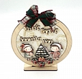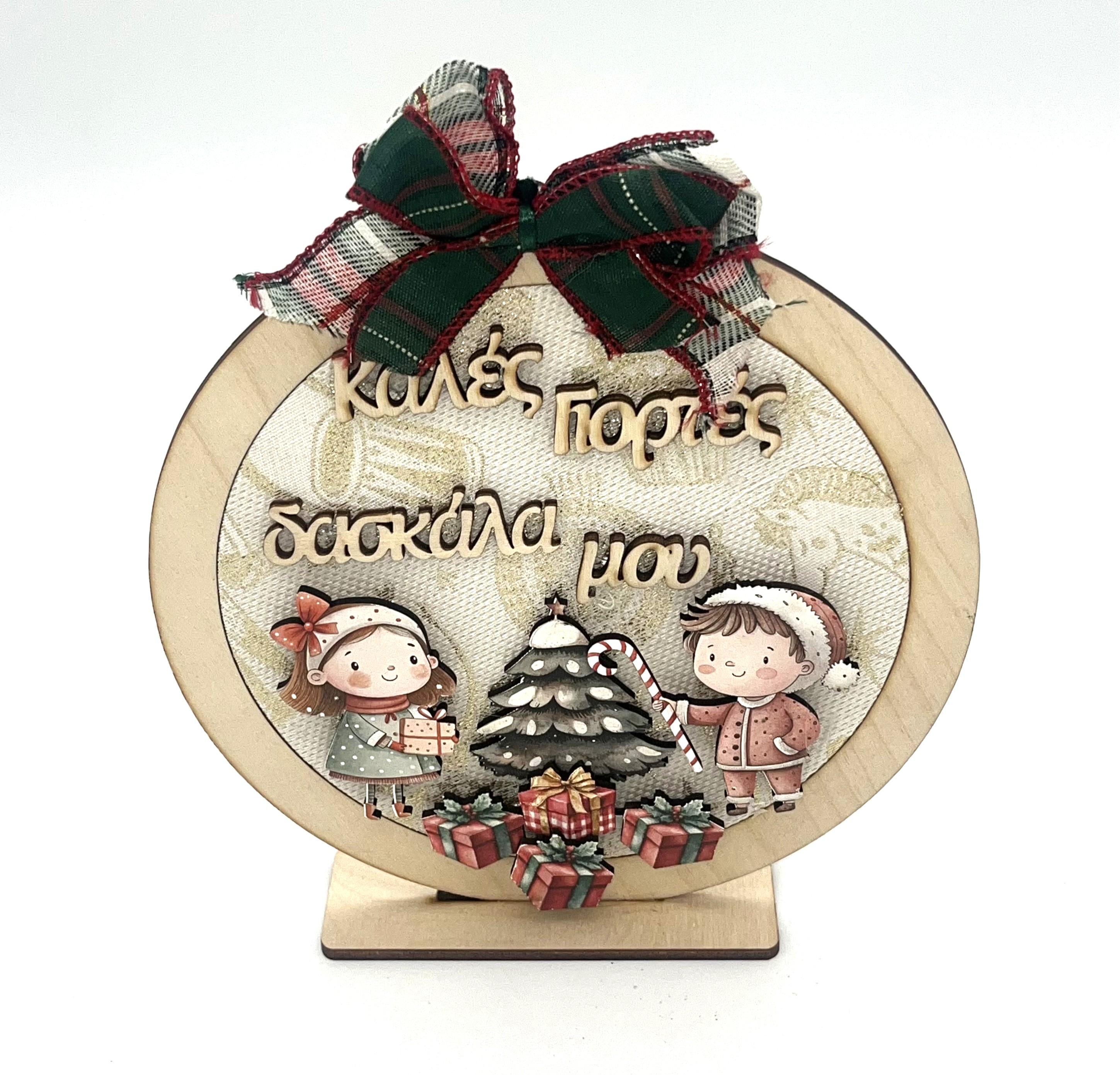 Χριστουγεννιάτικο διακοσμητικό από ξύλο με γλυκό, παιδικό σχέδιο και την ευχή «Καλές Γιορτές – Δασκαλία μου». Διακοσμείται με χαριτωμένες φιγούρες παιδιών, χριστουγεννιάτικο δέντρο και δώρα, ενώ ολοκληρώνεται με καρό φιόγκο στο επάνω μέρος που προσθέτει ζεστασιά και παραδοσιακό χαρακτήρα.