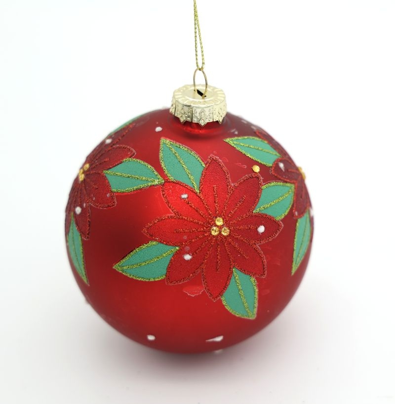 Κλασική χριστουγεννιάτικη μπάλα σε βαθύ κόκκινο χρώμα, διακοσμημένη με ανάγλυφα κόκκινα λουλούδια και πράσινα φύλλα, εμπνευσμένα από το αλεξανδρινό. Οι διακριτικές χρυσές λεπτομέρειες και τα μικρά λευκά στοιχεία προσδίδουν κομψότητα και γιορτινή λάμψη.