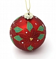 Κλασική χριστουγεννιάτικη μπάλα σε βαθύ κόκκινο χρώμα, διακοσμημένη με ανάγλυφα κόκκινα λουλούδια και πράσινα φύλλα, εμπνευσμένα από το αλεξανδρινό. Οι διακριτικές χρυσές λεπτομέρειες και τα μικρά λευκά στοιχεία προσδίδουν κομψότητα και γιορτινή λάμψη.