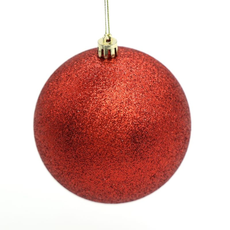 Κλασική χριστουγεννιάτικη μπάλα σε έντονο κόκκινο χρώμα με λαμπερό glitter που χαρίζει εντυπωσιακή λάμψη στο χριστουγεννιάτικο δέντρο. Η ομοιόμορφη γυαλιστερή υφή της αντανακλά το φως δημιουργώντας ζεστή και γιορτινή ατμόσφαιρα.