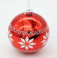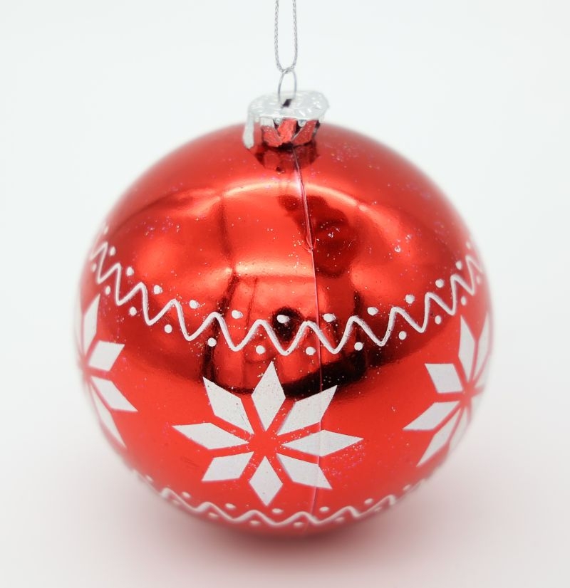 Κλασική χριστουγεννιάτικη μπάλα σε έντονο κόκκινο γυαλιστερό φινίρισμα, διακοσμημένη με λευκά σχέδια χιονονιφάδων και γεωμετρικά μοτίβα που θυμίζουν παραδοσιακό χειμερινό πλεκτό. Η λαμπερή επιφάνειά της αντανακλά όμορφα το φως, προσθέτοντας ζεστασιά και γιορτινή ατμόσφαιρα.