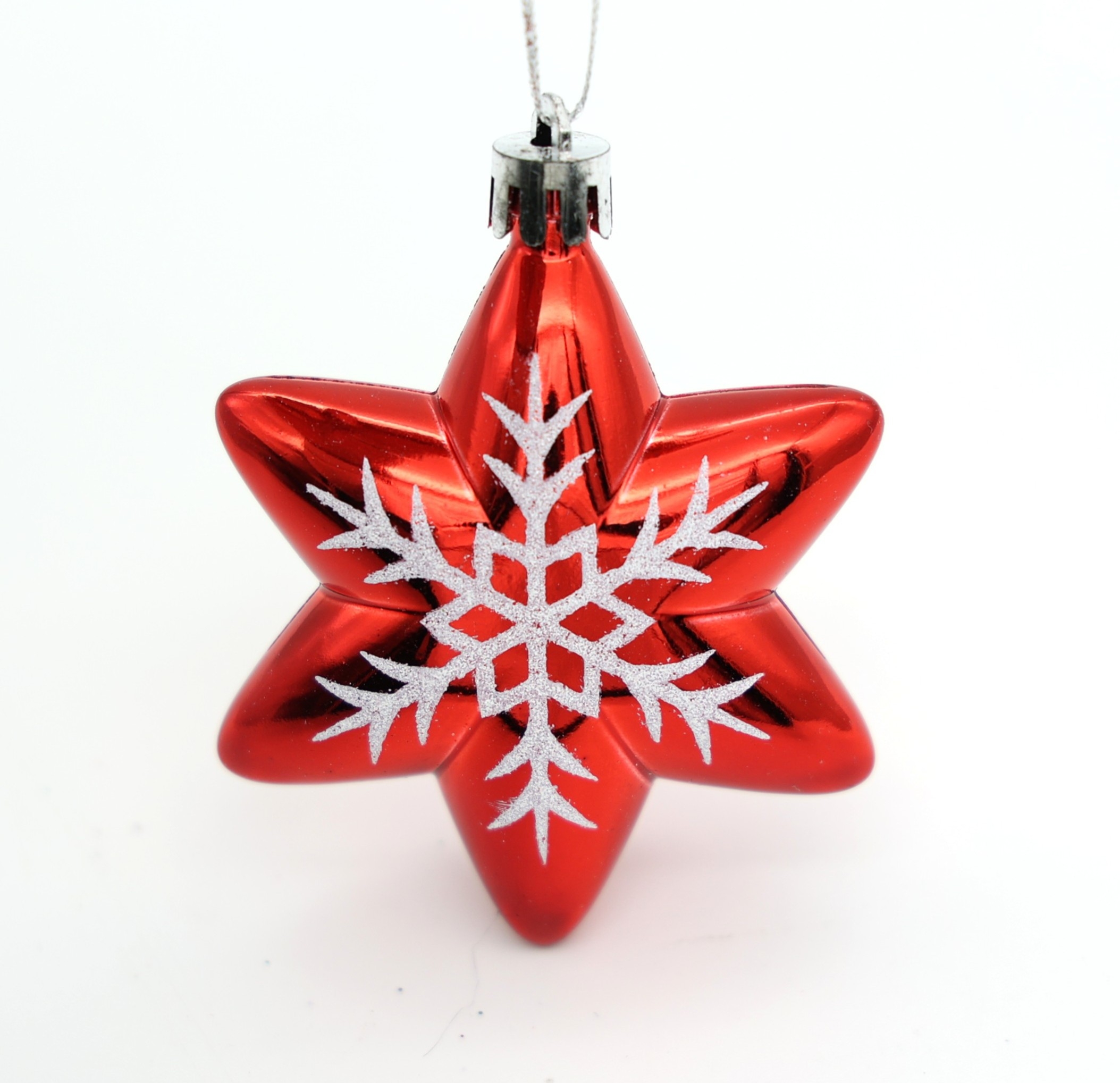Κλασικό χριστουγεννιάτικο στολίδι σε σχήμα αστεριού, σε λαμπερό κόκκινο χρώμα με γυαλιστερό φινίρισμα και διακοσμητική ασημί νιφάδα στο κέντρο. Ο κομψός και γιορτινός σχεδιασμός του προσθέτει ένταση και λάμψη στον χριστουγεννιάτικο στολισμό.