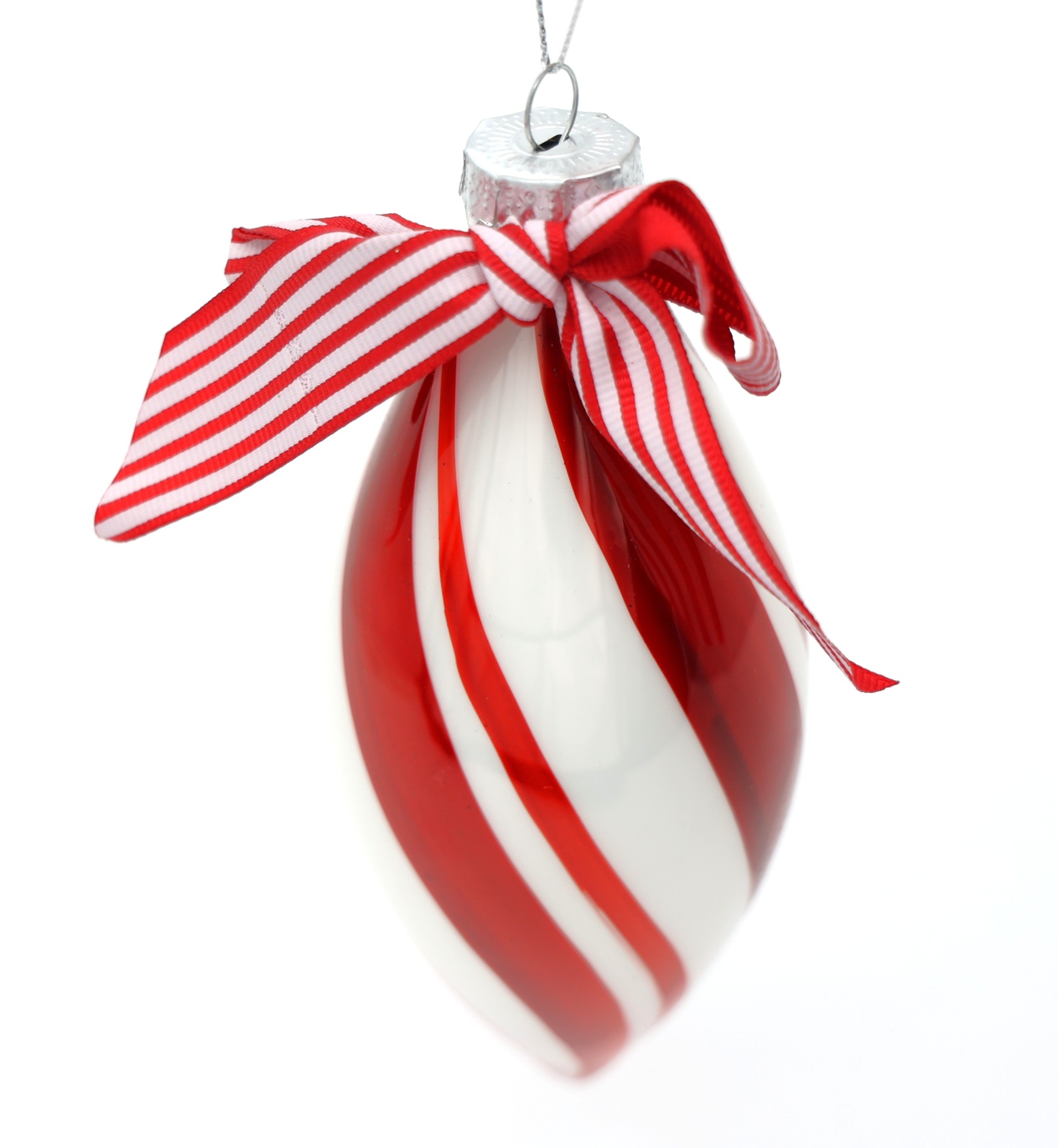 Κομψό χριστουγεννιάτικο γυάλινο στολίδι σε σχήμα σταγόνας, σε κόκκινο και λευκό χρωματικό συνδυασμό με γυαλιστερές ρίγες τύπου candy cane. Διακοσμείται με υφασμάτινο φιόγκο σε κόκκινο-λευκό ριγέ σχέδιο, προσθέτοντας μια γιορτινή και παιχνιδιάρικη πινελιά.