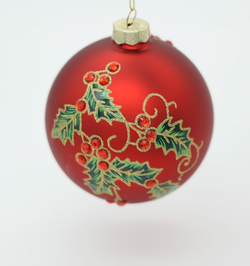 Κλασική χριστουγεννιάτικη μπάλα σε έντονο κόκκινο χρώμα, διακοσμημένη με μοτίβο από φύλλα γκι και καρπούς. Οι λεπτομέρειες τονίζονται με χρυσό περίγραμμα και κόκκινες διακοσμητικές πέτρες που προσθέτουν λάμψη και κομψότητα. Ιδανική για παραδοσιακό και elegant χριστουγεννιάτικο στολισμό.
