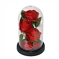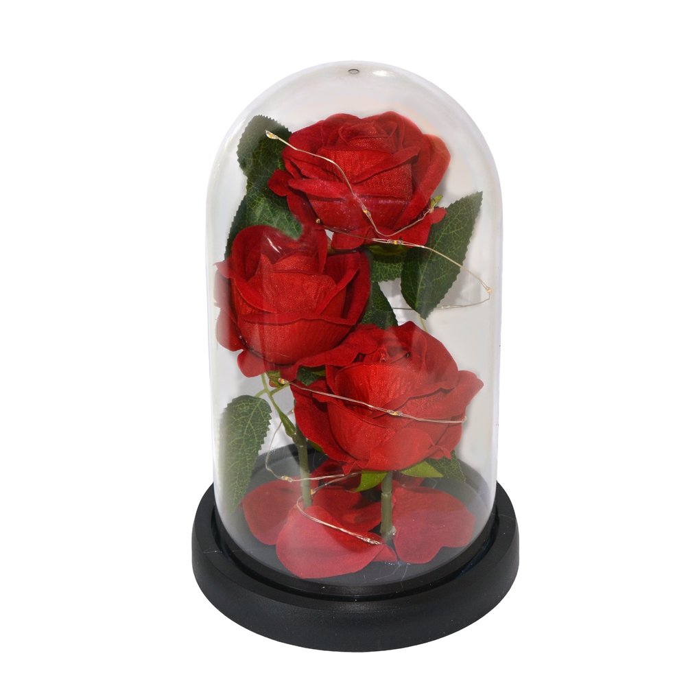 Η καμπάνα με τρία υφασμάτινα κόκκινα τριαντάφυλλα προσφέρει μια εντυπωσιακή και πολυτελή παρουσία, ιδανική για δώρα αγάπης, επετείους και θεματικές συλλογές. Το σώμα της είναι κατασκευασμένο από υψηλής αντοχής διαφανές πλαστικό, επιτρέποντας ξεκάθαρη θέαση της εσωτερικής σύνθεσης. Τα τριαντάφυλλα, προσεκτικά διαμορφωμένα από ύφασμα, δημιουργούν μια πλούσια και ρομαντική εικόνα, ενώ τα petals στη βάση συμπληρώνουν αρμονικά το σύνολο. Ο φωτισμός LED τυλίγει τη σύνθεση με μια ζεστή λάμψη, αναδεικνύοντας τις υφές και το βαθύ κόκκινο των λουλουδιών. Με διαστάσεις 22.5×14.5 cm, η καμπάνα έχει εντυπωσιακό όγκο, καθιστώντας την ιδανική για τοποθέτηση σε βιτρίνες καταστημάτων, ράφια, πάγκους και οικιακούς χώρους.