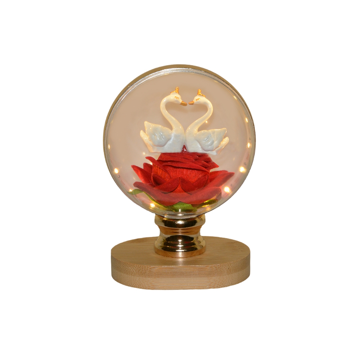 Μοντέρνα γυάλα διακόσμησης με εσωτερικό φωτισμό LED και φιγούρα δύο κύκνων που σχηματίζουν καρδιά. Στη βάση τοποθετείται υφασμάτινο κόκκινο τριαντάφυλλο, προσφέροντας μια ρομαντική και εντυπωσιακή εμφάνιση. Η γυάλα στηρίζεται σε κομψή ξύλινη βάση και λειτουργεί ως εξαιρετική επιλογή για δώρο, διακόσμηση σπιτιού ή βιτρίνας.