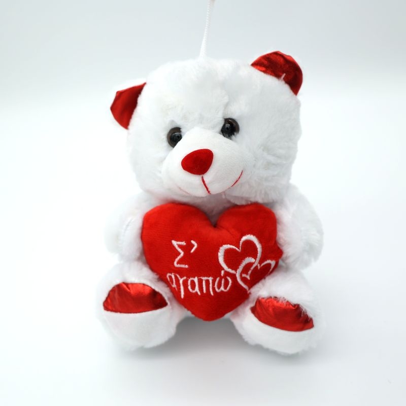 Χαριτωμένο λούτρινο αρκουδάκι σε λευκό χρώμα, που κρατά κόκκινη καρδιά με κεντημένη τη φράση «Σ’ αγαπώ». Ιδανικό για να εκφράσετε την αγάπη σας σε αγαπημένα πρόσωπα, προσφέροντας ένα τρυφερό και διαχρονικό δώρο.