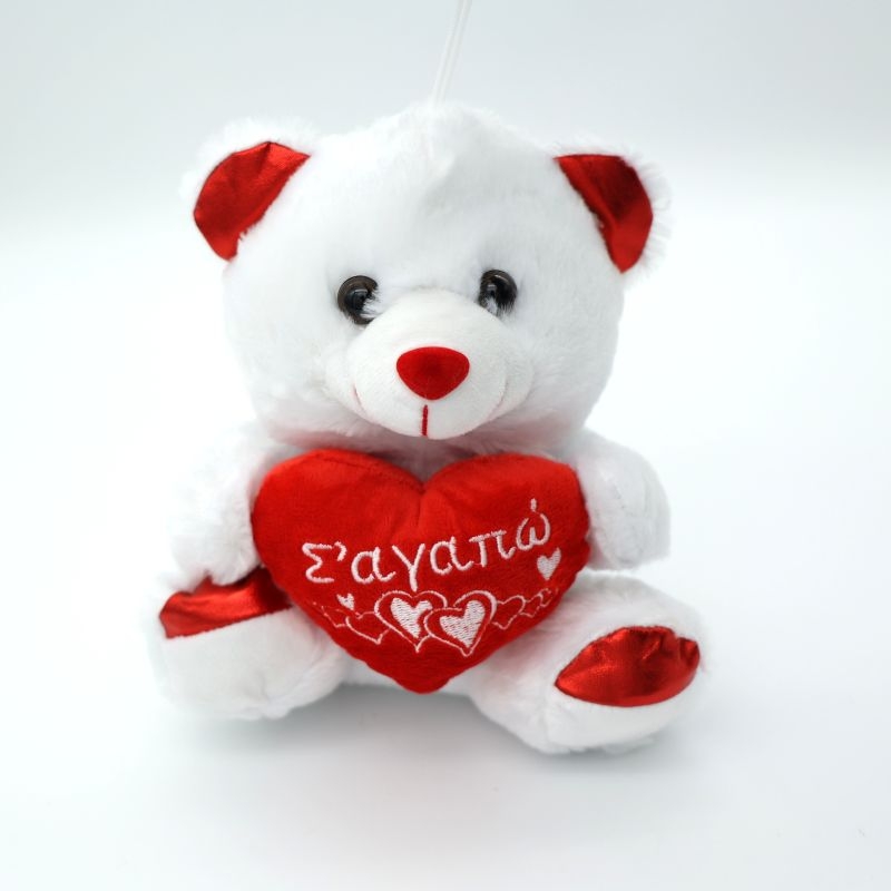 Γλυκό λούτρινο αρκουδάκι σε λευκό χρώμα με κόκκινες λεπτομέρειες, που κρατά μαλακή καρδιά με κεντημένη τη φράση «Σ’ αγαπώ». Ένα τρυφερό και ρομαντικό δώρο που εκφράζει αγάπη με τον πιο γλυκό τρόπο.