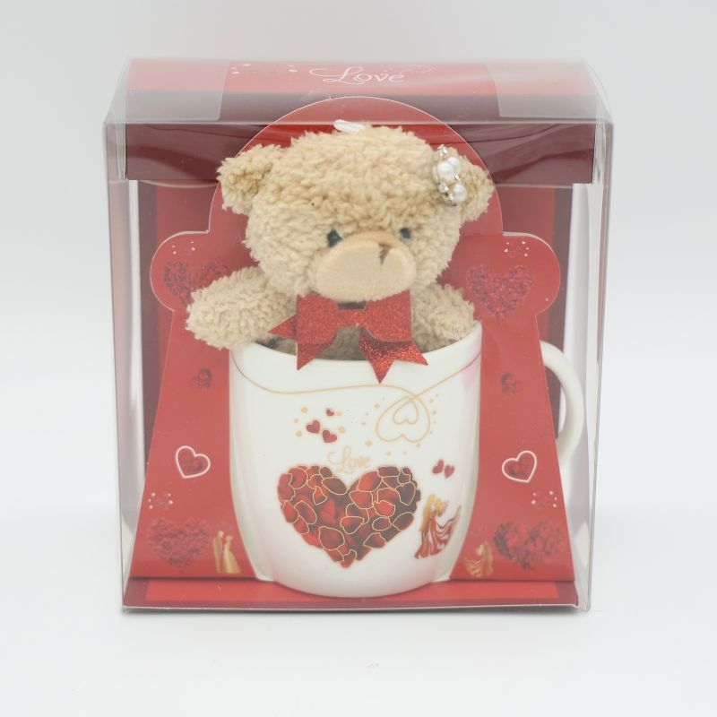 Εντυπωσιακό σετ δώρου Αγίου Βαλεντίνου που συνδυάζει κεραμική κούπα LOVE με λούτρινο αρκουδάκι, δημιουργώντας ένα ολοκληρωμένο και συναισθηματικά φορτισμένο προϊόν. Η κούπα διαθέτει λευκή βάση με ρομαντικό σχέδιο καρδιάς και ζευγαριού, καθώς και τη λέξη LOVE, ενώ το αρκουδάκι σε μπεζ χρώμα είναι τοποθετημένο μέσα στην κούπα, προσδίδοντας ιδιαίτερη αισθητική και αξία δώρου. Το σετ ολοκληρώνεται με σκληρή κόκκινη συσκευασία.