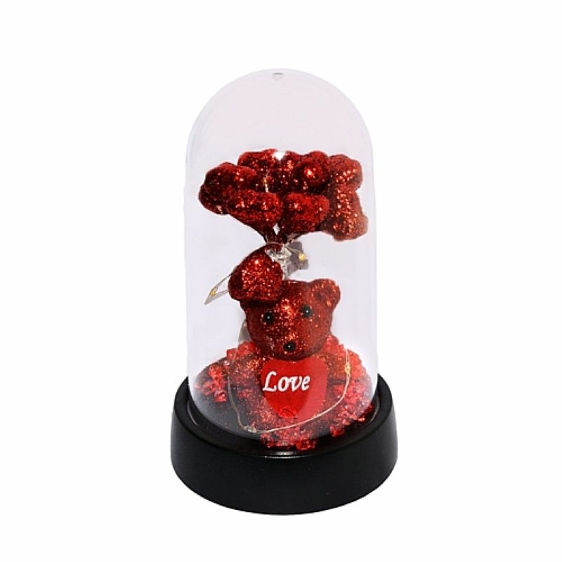 Η καμπάνα με αρκουδάκι και λαμπερά κόκκινα στοιχεία αποτελεί μια τρυφερή και εντυπωσιακή πρόταση δώρου, ιδανική για τον Άγιο Βαλεντίνο και για χώρους με θεματική αγάπης. Το σώμα της είναι κατασκευασμένο από ανθεκτικό, διαφανές πλαστικό που εξασφαλίζει ελαφριά και ασφαλή χρήση, ενώ το κόκκινο αρκουδάκι και τα glitter στοιχεία δημιουργούν έντονη οπτική λάμψη. Η ενσωματωμένη λειτουργία φωτισμού LED φωτίζει το εσωτερικό και δημιουργεί ζεστή ατμόσφαιρα.