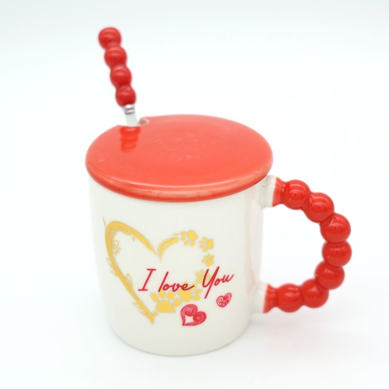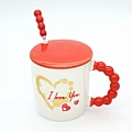 Ρομαντική κεραμική κούπα σε εκρού απόχρωση, διακοσμημένη με τη φράση “I Love You”, καρδιές και γλυκές λεπτομέρειες σε κόκκινους και χρυσούς τόνους. Διαθέτει κόκκινο καπάκι που βοηθά να διατηρείται το ρόφημα ζεστό, καθώς και κουταλάκι που εφαρμόζει στο επάνω μέρος για πρακτική και κομψή χρήση. Το ιδιαίτερο κόκκινο χερούλι με σφαιρικό σχέδιο προσθέτει παιχνιδιάρικο και ξεχωριστό χαρακτήρα.