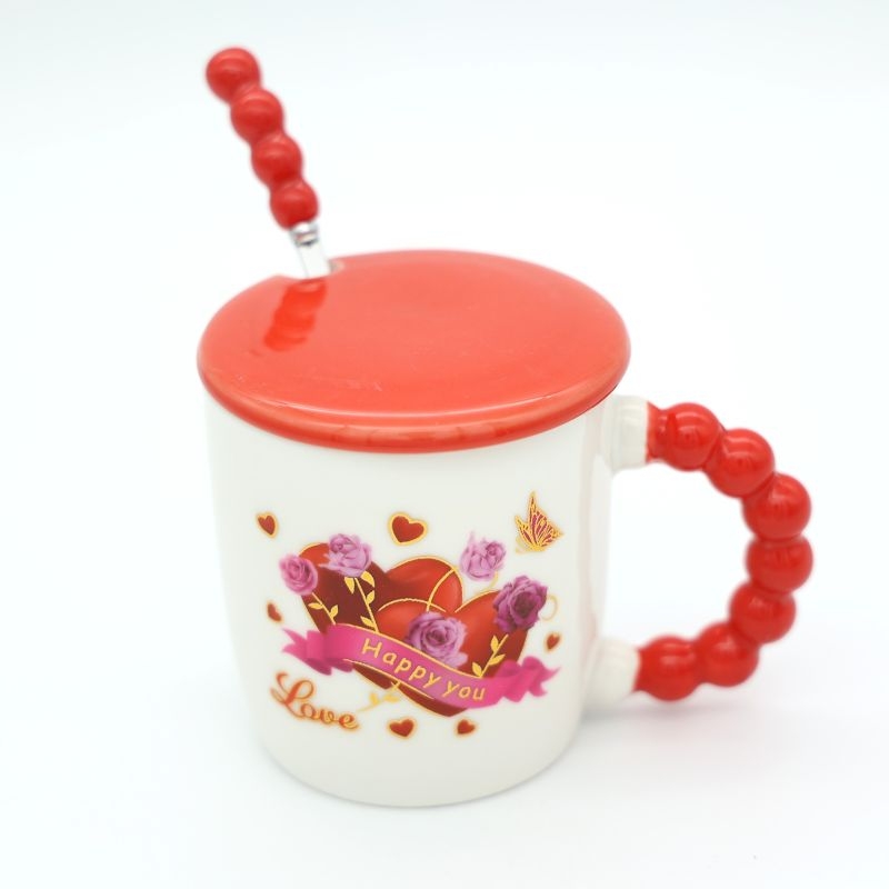 Κεραμική κούπα Αγίου Βαλεντίνου χωρητικότητας 340ml, με ρομαντικά σχέδια που περιλαμβάνουν καρδιές, λουλούδια και μηνύματα αγάπης, σχεδιασμένη για εποχικές συλλογές δώρων. Η κούπα συνοδεύεται από κεραμικό καπάκι, που βοηθά στη διατήρηση της θερμοκρασίας του ροφήματος, καθώς και από κουταλάκι με διακοσμητική λαβή, προσφέροντας ολοκληρωμένη και πρακτική χρήση.