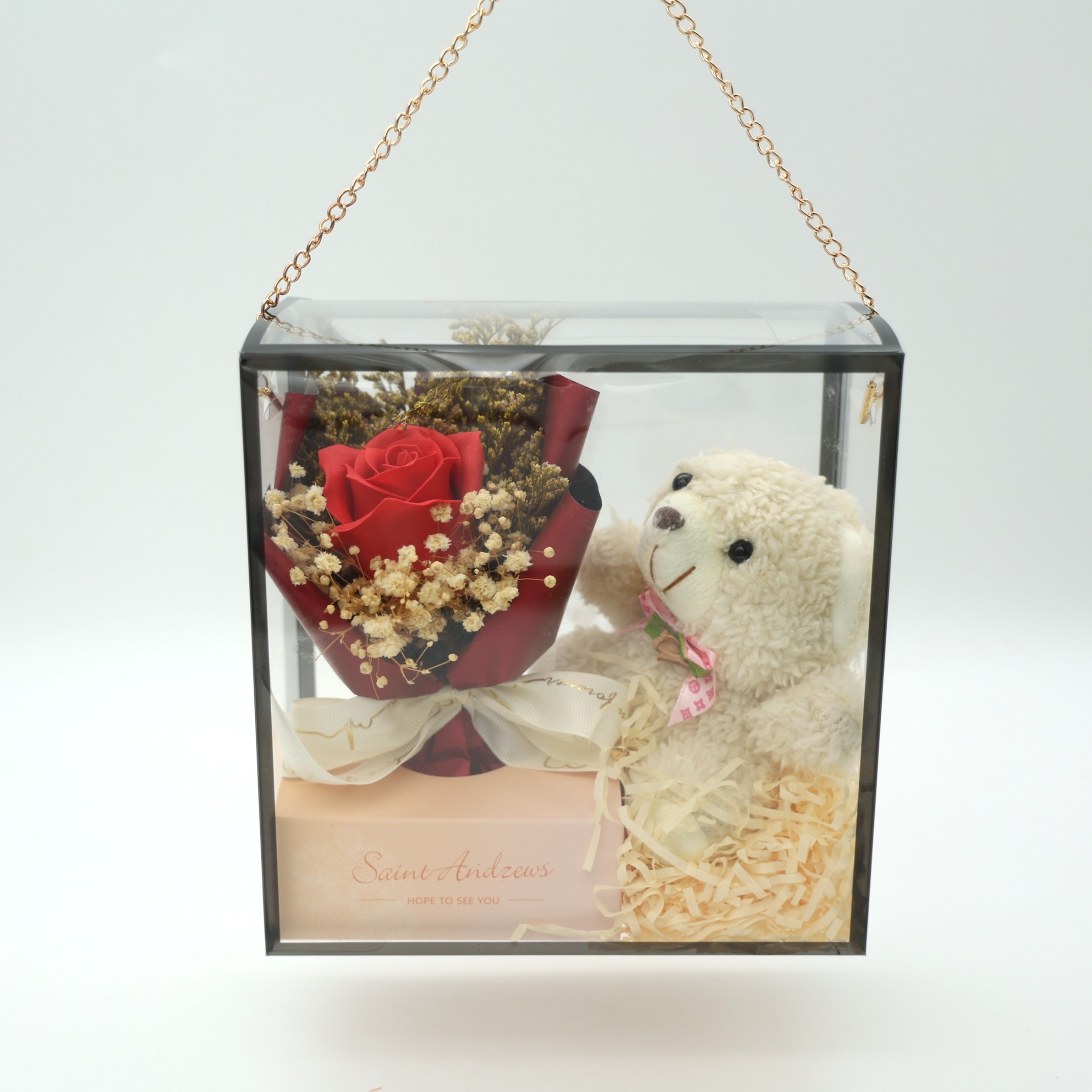Ένα υπέροχο αρκουδάκι που κρατάει ανθοδέσμη από διακοσμητικά λουλούδια σαπουνιού, ιδανικό για δώρο αγάπης ή ιδιαίτερη προσθήκη σε κάθε χώρο. Το σετ τοποθετείται μέσα σε διάφανο κουτί υψηλής αισθητικής με χρυσή αλυσίδα.