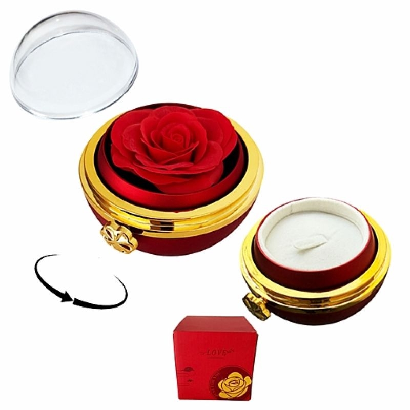 Μια ξεχωριστή και πολυτελής πρόταση για δώρο, η οποία συνδυάζει πρακτικότητα και υψηλή αισθητική. Η θήκη διαθέτει διαφανές καπάκι, στο εσωτερικό της φιλοξενεί ένα εντυπωσιακό τριαντάφυλλο σαπουνιού, ενώ η βάση της μπορεί να περιστρέφεται, αναδεικνύοντας το περιεχόμενο. Στο κέντρο υπάρχει ειδικά διαμορφωμένη θήκη για δαχτυλίδι, ιδανική για προτάσεις γάμου, ρομαντικές στιγμές. Το προϊόν συνοδεύεται από κομψό κουτί δώρου.