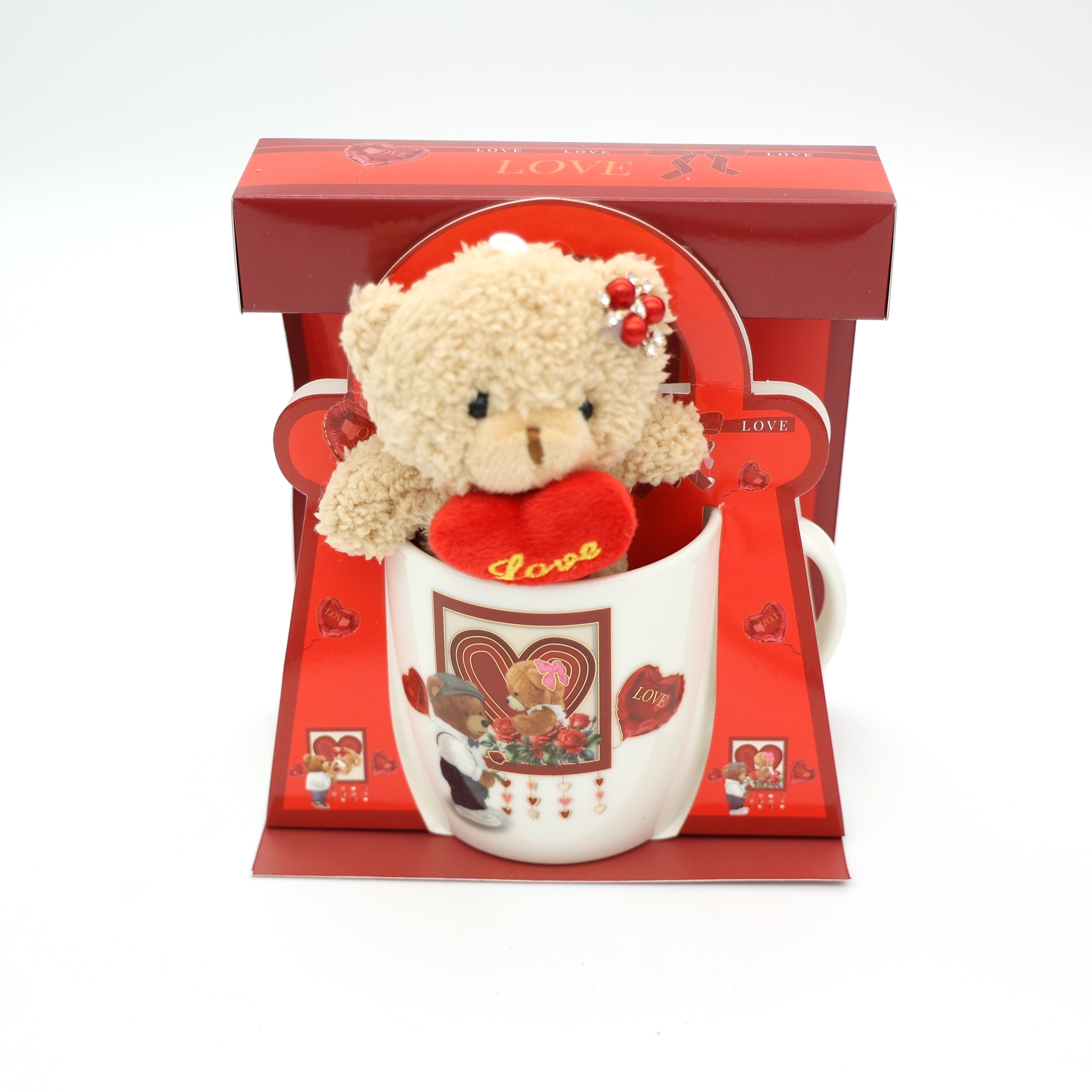 Ρομαντικό σετ δώρου Αγίου Βαλεντίνου, σχεδιασμένο για άμεση διάθεση στη χονδρική. Το σετ περιλαμβάνει κεραμική κούπα με τυπωμένο σχέδιο LOVE και λούτρινο αρκουδάκι σε μπεζ χρώμα, το οποίο κρατά υφασμάτινη καρδιά με τη λέξη “LOVE”. Το αρκουδάκι είναι τοποθετημένο μέσα στην κούπα, δημιουργώντας ένα ιδιαίτερα ελκυστικό και συναισθηματικό αποτέλεσμα, ιδανικό για δώρο.