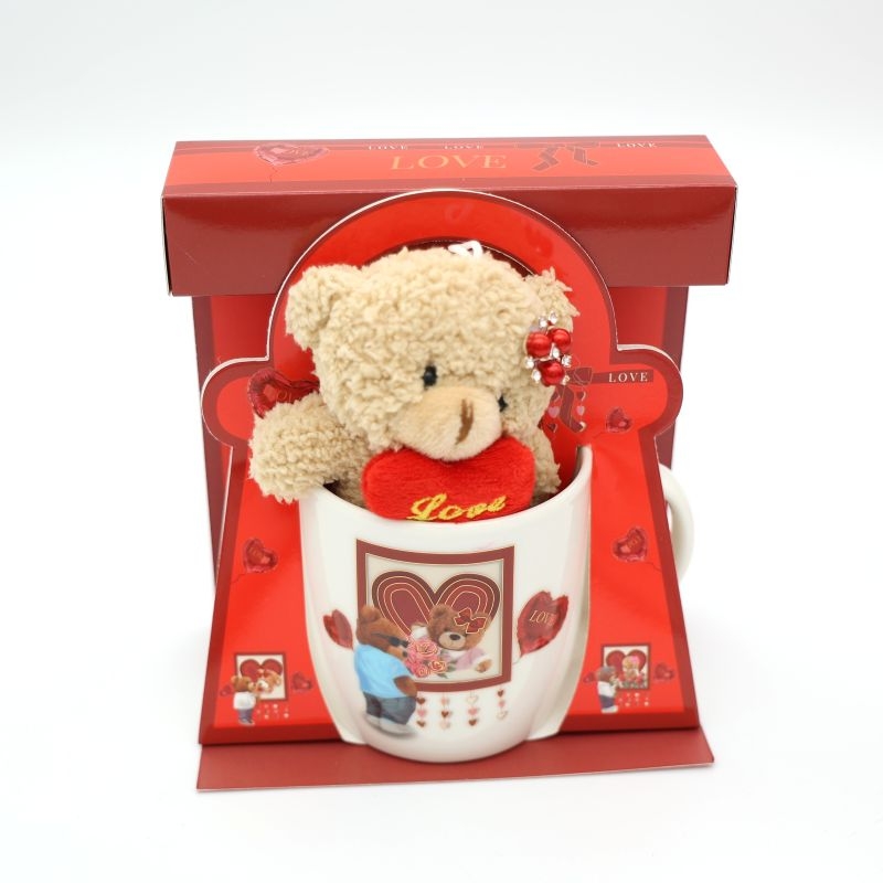 Ρομαντικό σετ δώρου Αγίου Βαλεντίνου, σχεδιασμένο για άμεση διάθεση στη χονδρική. Το σετ περιλαμβάνει κεραμική κούπα με τυπωμένο σχέδιο LOVE και λούτρινο αρκουδάκι σε μπεζ χρώμα, το οποίο κρατά υφασμάτινη καρδιά με τη λέξη “LOVE”. Το αρκουδάκι είναι τοποθετημένο μέσα στην κούπα, δημιουργώντας ένα ιδιαίτερα ελκυστικό και συναισθηματικό αποτέλεσμα, ιδανικό για δώρο.