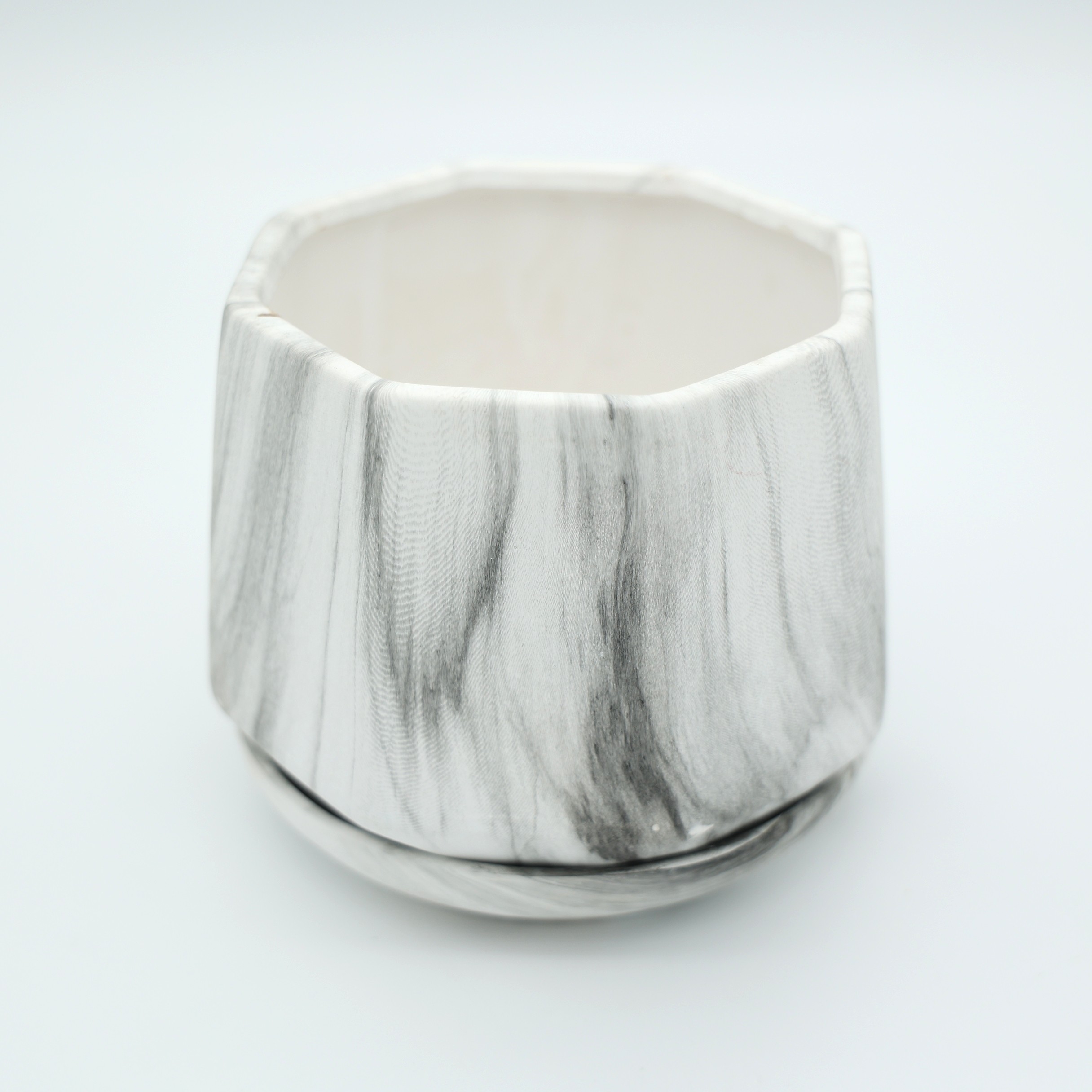 Το κεραμικό κασπώ με μαύρο–γκρι εφέ μαρμάρου, αποτελεί μια εντυπωσιακή και μοντέρνα επιλογή για χώρους που απαιτούν διαχρονικότητα και αισθητική. Το μαρμάρινο σχέδιο σε λευκή βάση με σκιές σε μαύρο και γκρι δημιουργεί ένα minimal αλλά ταυτόχρονα πολυτελές αποτέλεσμα. Οι διαστάσεις του είναι 15.5x15.5x13cm κατάλληλο για μεσαίου μεγέθους φυτά .Κάθε κασπώ συνοδεύεται από πιατάκι για προστασία από υγρασία και καθαρή χρήση, ενώ η στιβαρή κεραμική κατασκευή εξασφαλίζει σταθερότητα και αντοχή.