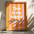 Ο πίνακας Happo είναι ένα εκρηκτικό, χαρούμενο statement piece, ιδανικό για να προσθέσει θετική ενέργεια και ζωντάνια σε οποιοδήποτε δωμάτιο. Διαθέτει την ενθαρρυντική φράση "This is my happy place" (Αυτό είναι το μέρος της ευτυχίας μου) σε κίτρινα, μεγάλα γράμματα, πάνω σε ένα φόντο με έντονες πορτοκαλί και ροζ ρίγες.