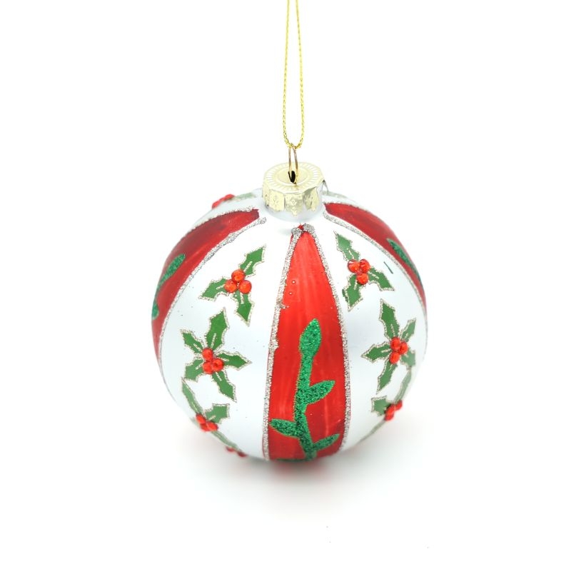 Διακοσμητική χριστουγεννιάτικη μπάλα σε λευκό χρώμα, με κόκκινες λωρίδες και πράσινα σχέδια φυλλωμάτων με γκλίτερ. Κλασικό και κομψό στολίδι για το χριστουγεννιάτικο δέντρο ή τη γιορτινή διακόσμηση του χώρου.