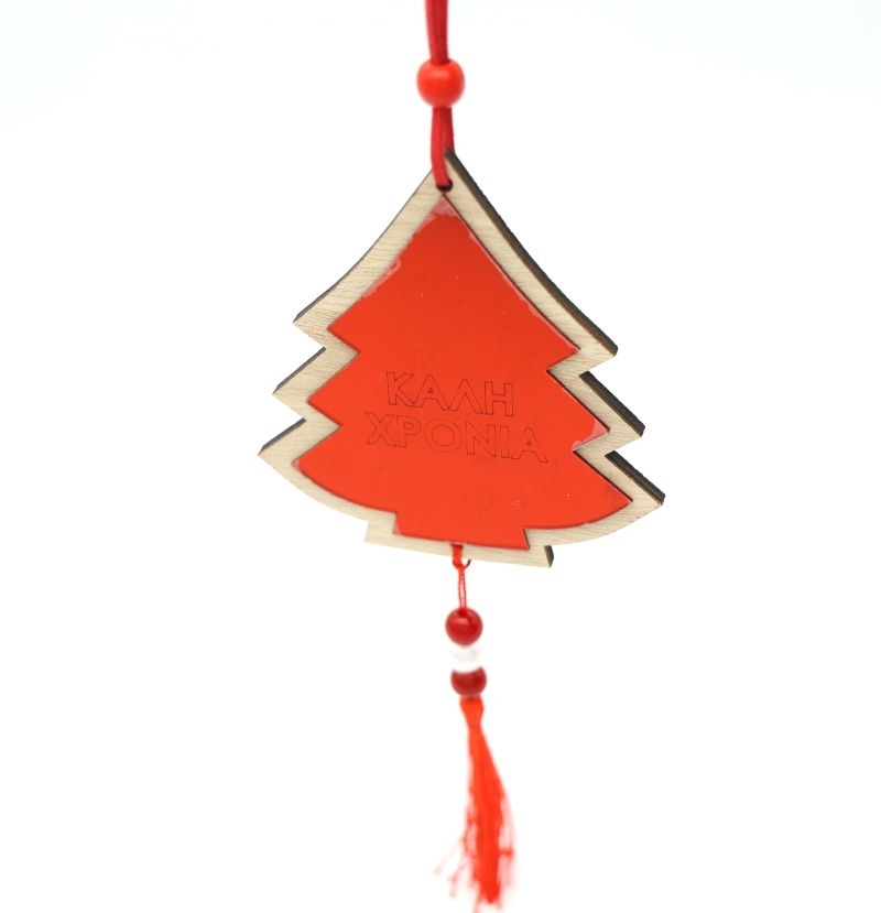 Κομψό χριστουγεννιάτικο στολίδι σε σχήμα δέντρου, κατασκευασμένο από ξύλο, σε κόκκινο χρώμα. Διακοσμημένο με την ευχή «Καλή Χρονιά», κατάλληλο για το χριστουγεννιάτικο δέντρο, πόρτα ή χώρο υποδοχής.