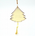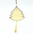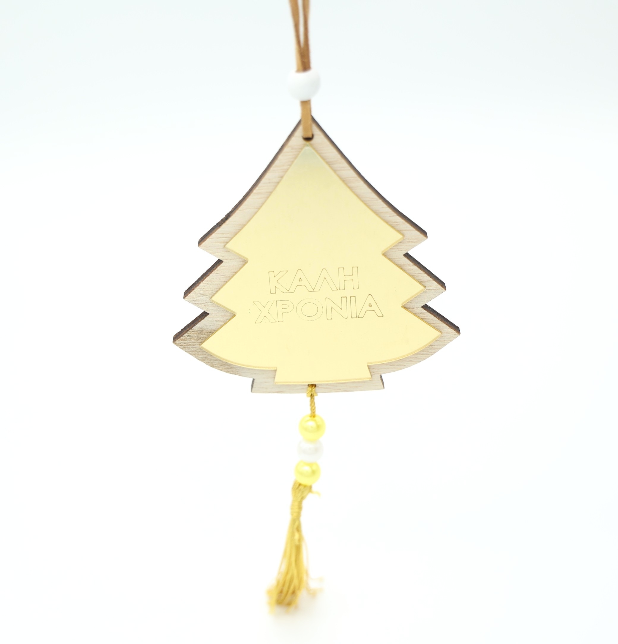 Κομψό χριστουγεννιάτικο στολίδι σε σχήμα δέντρου, κατασκευασμένο από ξύλο, σε χρυσό χρώμα. Διακοσμημένο με την ευχή «Καλή Χρονιά», κατάλληλο για το χριστουγεννιάτικο δέντρο, πόρτα ή χώρο υποδοχής.
