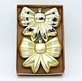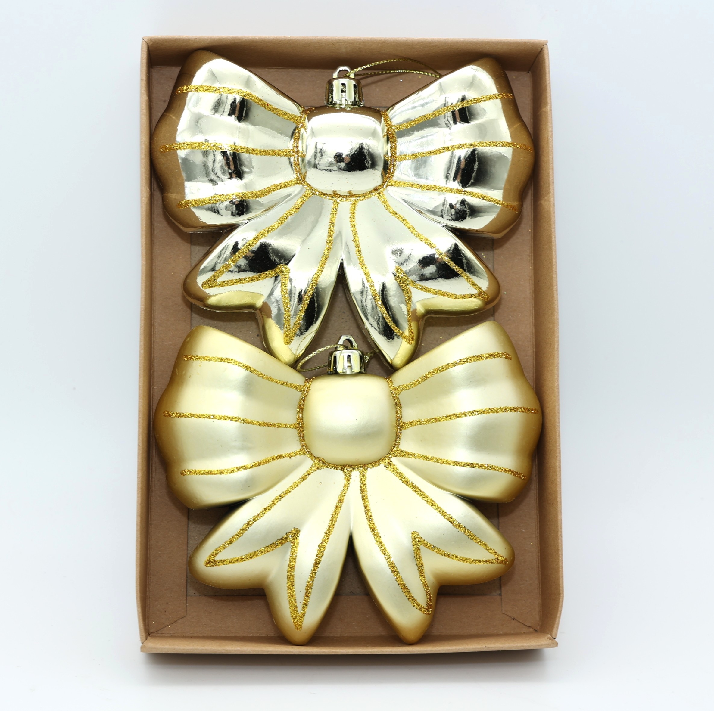 Κομψό σετ χριστουγεννιάτικων στολιδιών σε σχήμα φιόγκου, σε αποχρώσεις του χρυσού με διακριτικές glitter λεπτομέρειες. Το σετ περιλαμβάνει δύο στολίδια και είναι ιδανικό για το χριστουγεννιάτικο δέντρο, στεφάνια ή γιορτινή διακόσμηση εσωτερικού χώρου.