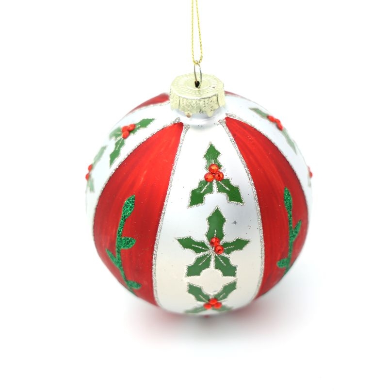 Διακοσμητική χριστουγεννιάτικη μπάλα σε λευκό χρώμα, με κόκκινες λωρίδες και πράσινα σχέδια φυλλωμάτων με γκλίτερ. Κλασικό και κομψό στολίδι για το χριστουγεννιάτικο δέντρο ή τη γιορτινή διακόσμηση του χώρου.