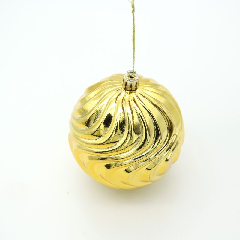 Εντυπωσιακή χριστουγεννιάτικη μπάλα σε λαμπερό χρυσό χρώμα, με κομψό ανάγλυφο κυματιστό σχέδιο που αντανακλά το φως και προσθέτει πολυτέλεια στη διακόσμηση. Το γυαλιστερό φινίρισμα δημιουργεί μια ζεστή και εκλεπτυσμένη αίσθηση, ιδανική για κλασικά αλλά και μοντέρνα χριστουγεννιάτικα θέματα. Διαθέτει ανθεκτικό κορδονάκι για εύκολη ανάρτηση.
