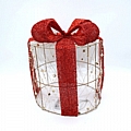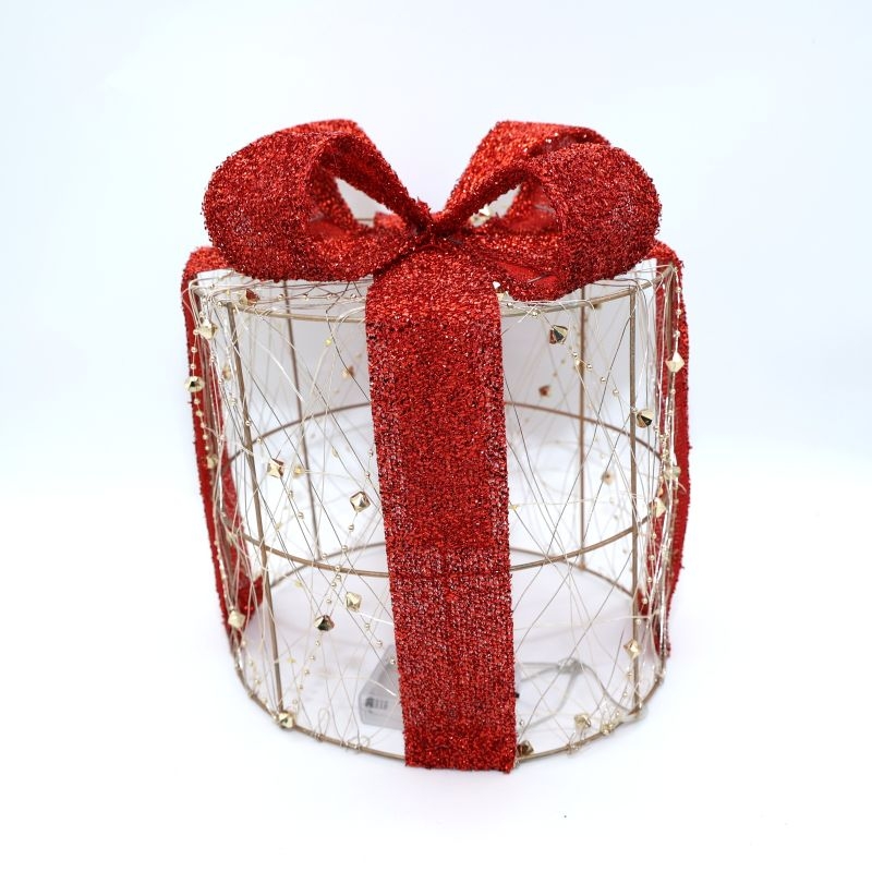 Εντυπωσιακό διακοσμητικό κουτί δώρου με μεταλλική κατασκευή και λαμπερές λεπτομέρειες. Ο κόκκινος γκλίτερ φιόγκος προσθέτει μια αίσθηση πολυτέλειας και γιορτινής κομψότητας, ενώ τα λεπτά χρυσά στοιχεία δημιουργούν ένα ιδιαίτερο, φωτεινό αποτέλεσμα. Ιδανικό για χριστουγεννιάτικη διακόσμηση, βιτρίνες καταστημάτων ή ως ξεχωριστό statement κομμάτι σε κάθε χώρο.